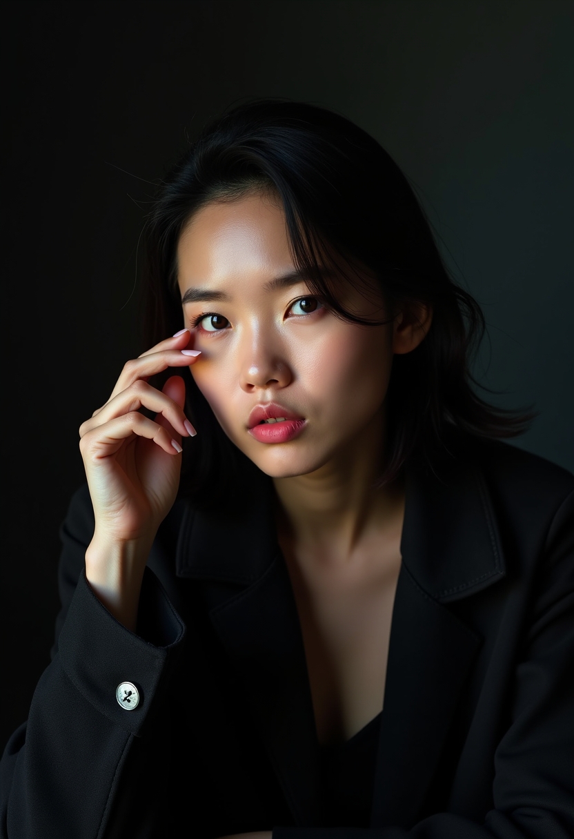 Қара пиджак киген әйел қара қабырға фонында отыр, оның жүзіне екі жіңішке жарық сызығы түсіп тұр — бірі ерініне, бірі бет сүйегіне тиеді. Қалған кеңістік қараңғылықта. Жарық нүктелік, бөлшектер мен текстураны айқындайды.