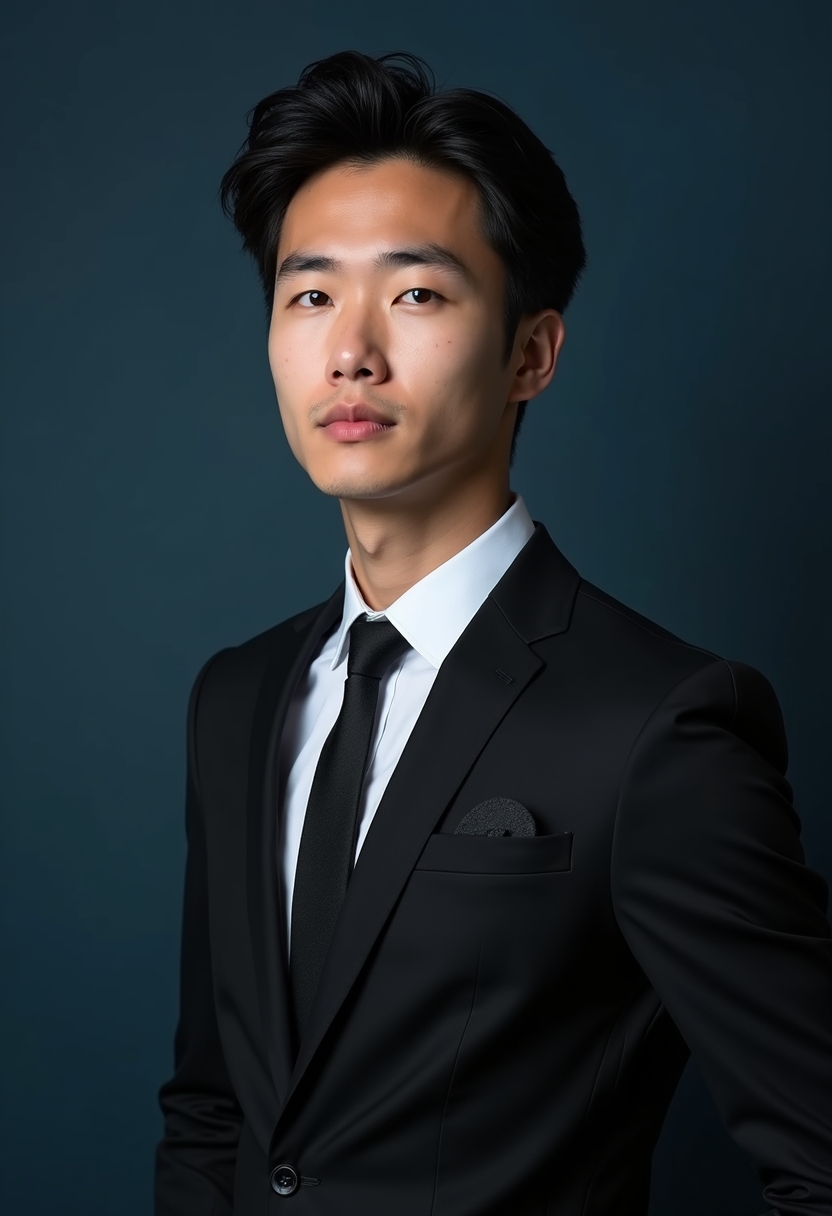 Классикалық қою костюм мен ақ жейде киген ер адам жеңіл көлеңкелі фонда сенімді қалыпта, тура камераға қарап тұр