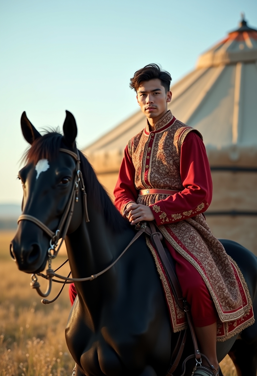 Дәстүрлі киіз үйдің жанында көне нақышты шапан киген жас жігіт тұр. Оның басында оюлы тақия, көзі тікелей камераға бағытталып, байсалды әрі мақтанышпен қарауда. Айналасында кең дала, көгілдір аспан мен жасыл өсімдіктер табиғи сұлулықты айшықтайды. Табиғи жарық оның қас бетін нәзік жарықтандырып,...