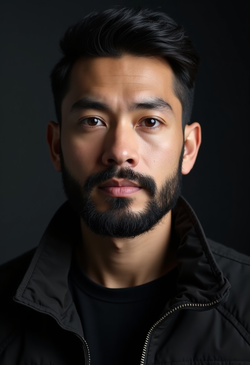 Қараңғы фонда, жұмсақ жарықпен көмкерілген қара пиджак киген сақалды ер адам тура камераға қарап тұр