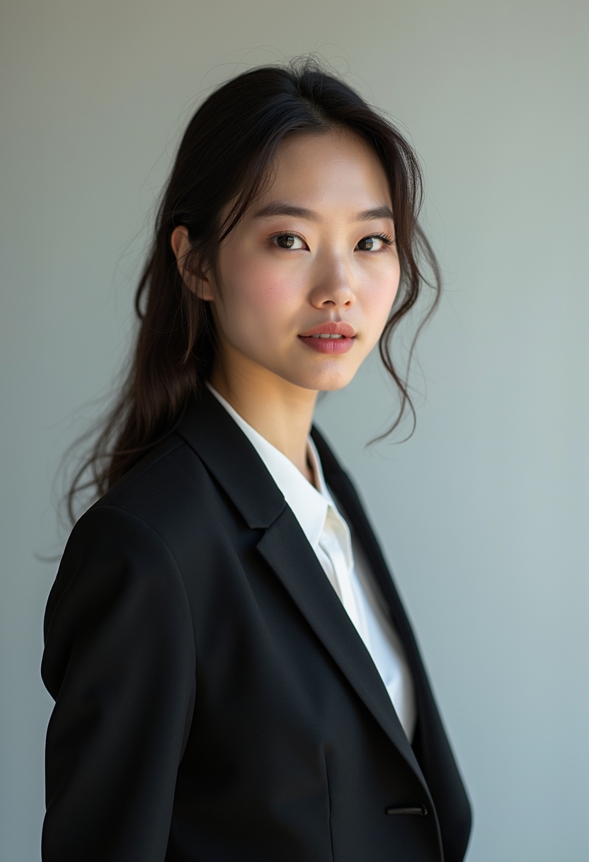 Қатаң блейзер мен минималды макияждағы әйел жұмсақ градиентті жарық аясында, тура камераға қарап тұр