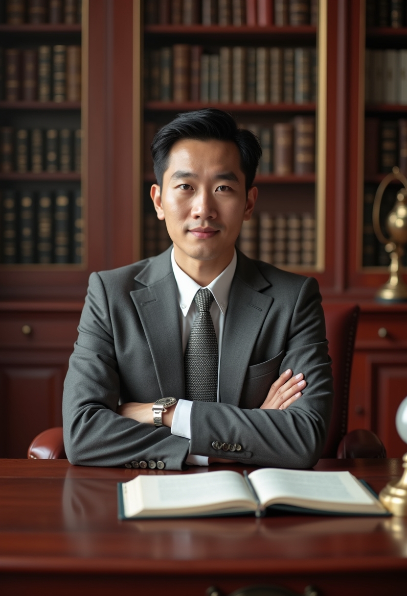 Қатаң сұр костюм, ақ көйлек және запонка таққан ер адам қызыл ағаштан жасалған үлкен жазу үстелінің басында отыр. Оның қолдары алдында айқасқан, көзі камераға бағытталған. Артқы жағында былғары мұқабалы кітаптармен толтырылған кітапхана және жезден жасалған үстел шамы көрінеді. Жылы жарық, оның...