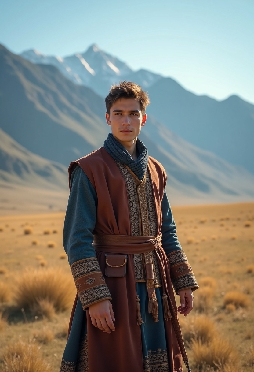Өз бейнеңізде көруҚара жылқы мініп, киіз үй алдында отырған жас жігіт, әдемі ұлттық костюмде. Оның атынан ұстап, тікелей камераға қарап тұр. Оның айналасында кең дала мен көкжиекке созылған жазықтық. Ашық аспан және табиғаттың сұлулығы мен тыныштығы сезіледі.
