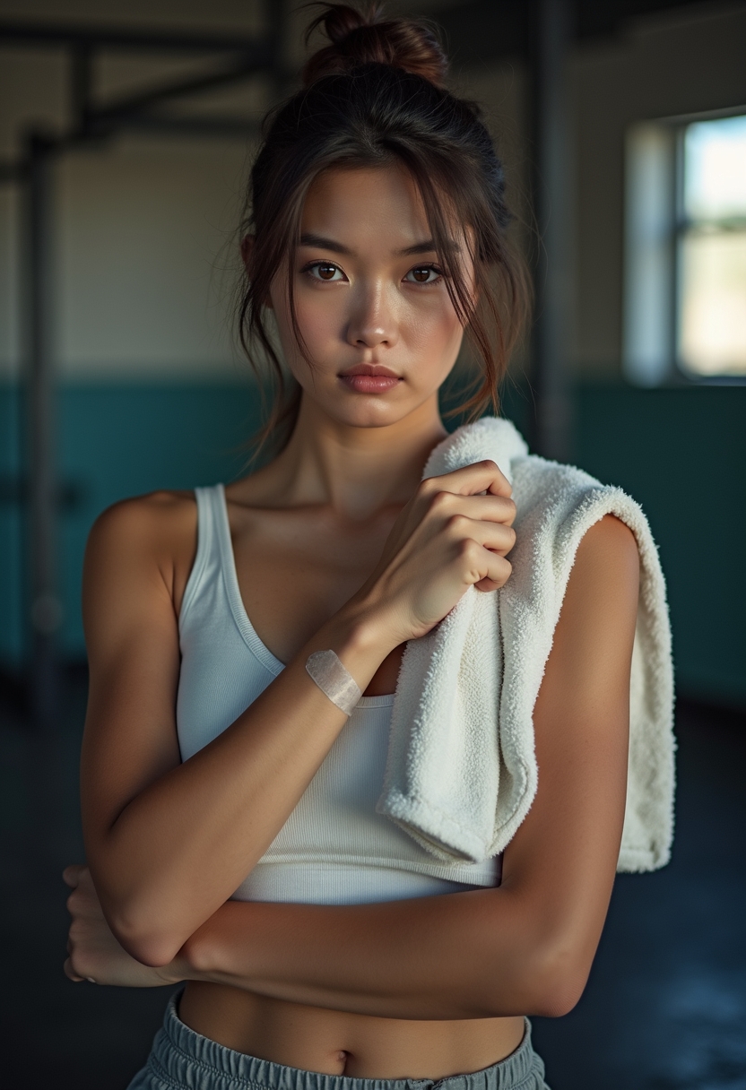 Қолында бинт, иығында сүлгі бар боксшы әйел адам жарық пен көлеңке арасындағы залда тұрып, тура камераға көз тастап тұр