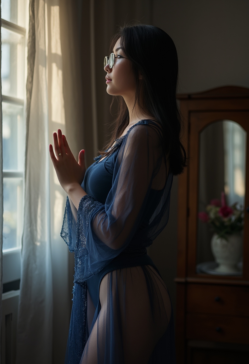 Қою көк боди мен мөлдір халат киген әйел қабырға жанында тұр, қолдары жоғары көтерілген, денесі профильмен аздап бұрылған. Жанындағы терезеден түскен жарық жартылай қараңғылықты тіліп, силуэтті ерекшелеп тұр. Арт жағында айнасы бар винтажды ағаш шкаф, көрініс бөлшектерін бейнелейді. Жақын план, жарық пен көлеңке ойыны матаның текстурасын айқындайды.
