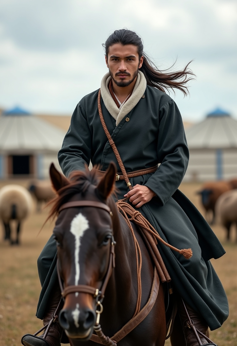 Қою түсті шапан мен ақ бөрік киген ер адам атқа мініп тұр, қолында ұлттық қамшы бар. Ол тура камераға батыл қарап тұр, ал артында киіз үйлер мен жайылымдағы қойлар көрінеді. Жел оның шапанын желбіретіп, атмосфераға ерекше әсер береді.