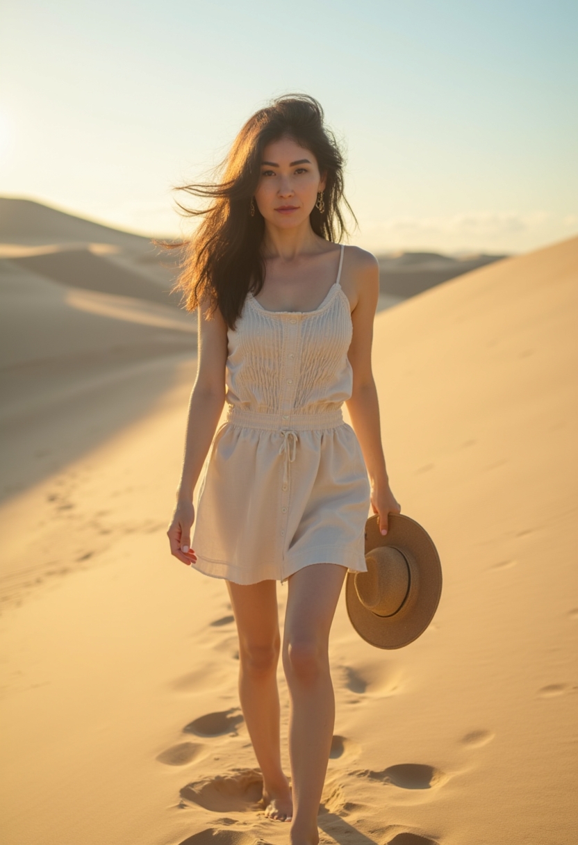 Қысқа сарафан мен жалаңаяқ әйел құмды соқпақпен дюналар арасымен келе жатыр, қолында қалпақ бар. Шашы желмен тербеліп, жүзі жылы күн сәулесімен жарқырап тұр. Артында көкжиек пен аспан бір-бірімен тұтасып жатыр. Жақын жоспар, еркіндік пен табиғилықты көрсетеді.