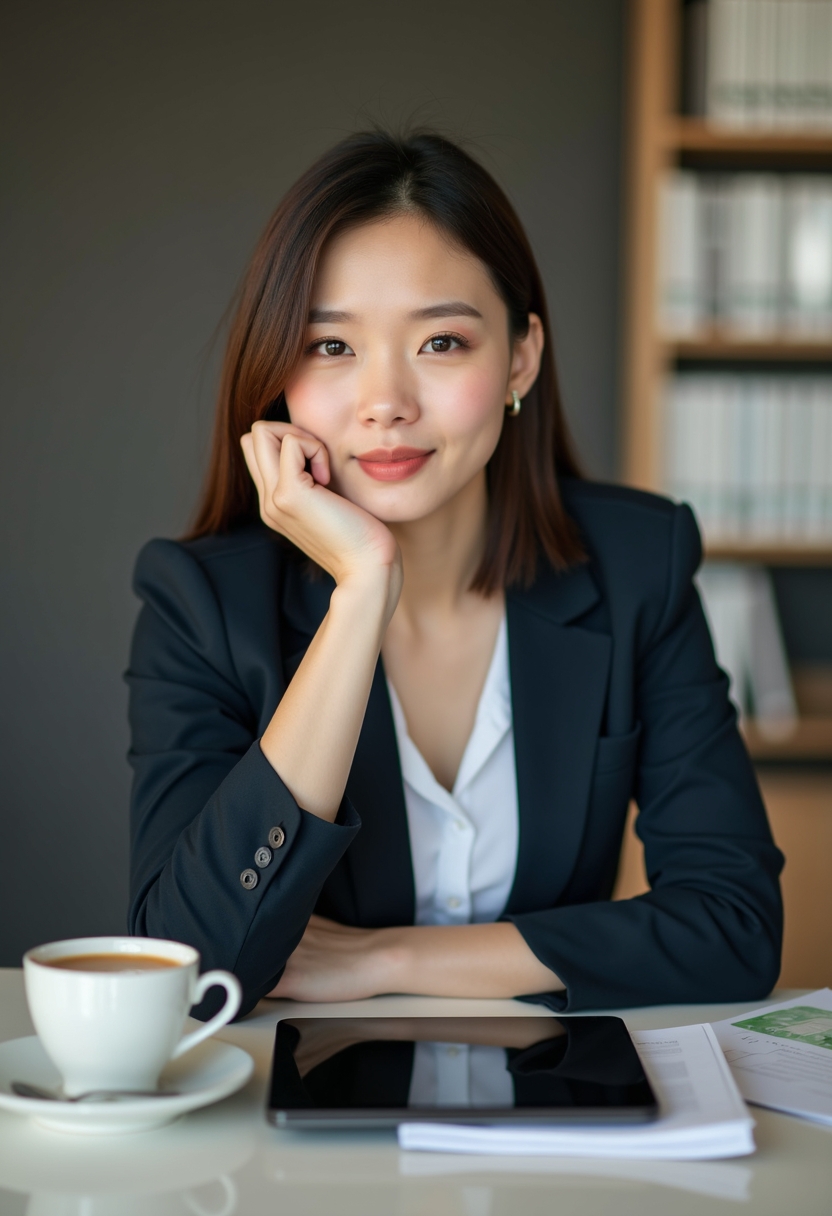 Қызметтік көйлек киген әйел мұғалім үстелінде шынтақтап отырып, камераға қарап отыр. Үстелде — кітаптар, планшет пен кофе шыныаяғы. Жақын жоспар, мамандыққа заманауи көзқарасты көрсетеді.