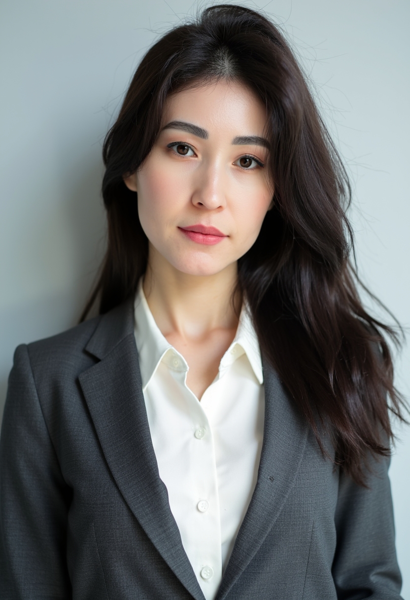 Сәнді блейзер мен ақ жейде киген әйел жеңіл макияжбен ашық-сұр фонда, тура камераға қарап тұр