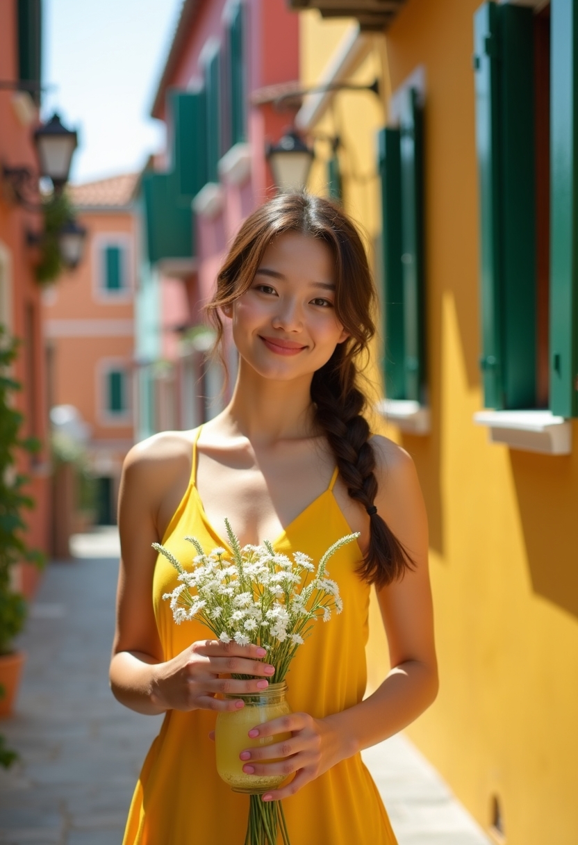 Сары сарафан киген әйел қолында дала гүлдерімен ескі қаланың тар көшесінде тұр, шашы әдемі өрілген, ал қолында мұз қосылған лимонад бар. Артында жасыл жапқышты жарқын түсті үйлер мен ілулі шамдар. Жақын жоспар, жазғы демалыс атмосферасын береді.