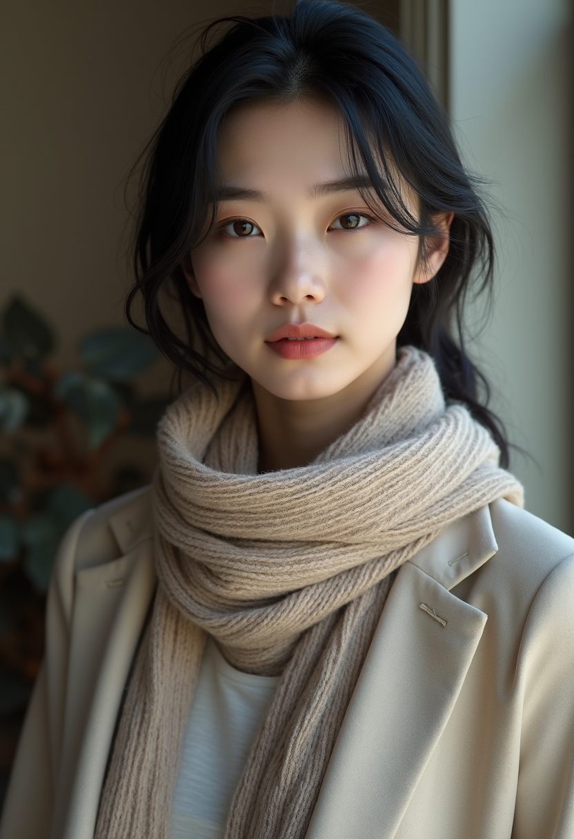 Шарф тағылған күнделікті ұқыпты киімдегі әйел студиялық жарықта, фонда аздап бұлыңғырлық бар, тура камераға қарап тұр