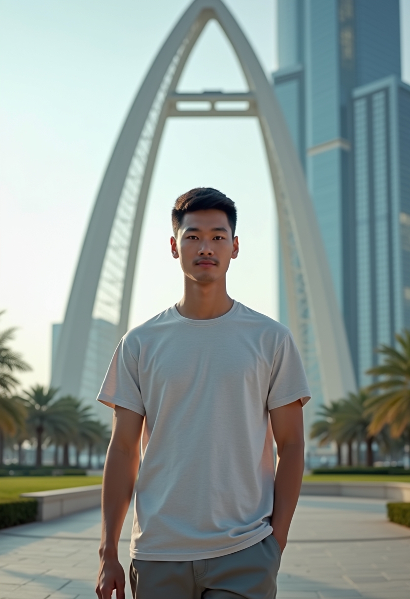 Шорты мен футболка киген ер адам Dubai Frame ғимаратының алдында тұр, тура камераға қарайды, айналасында қалалық саябақ көрінеді.