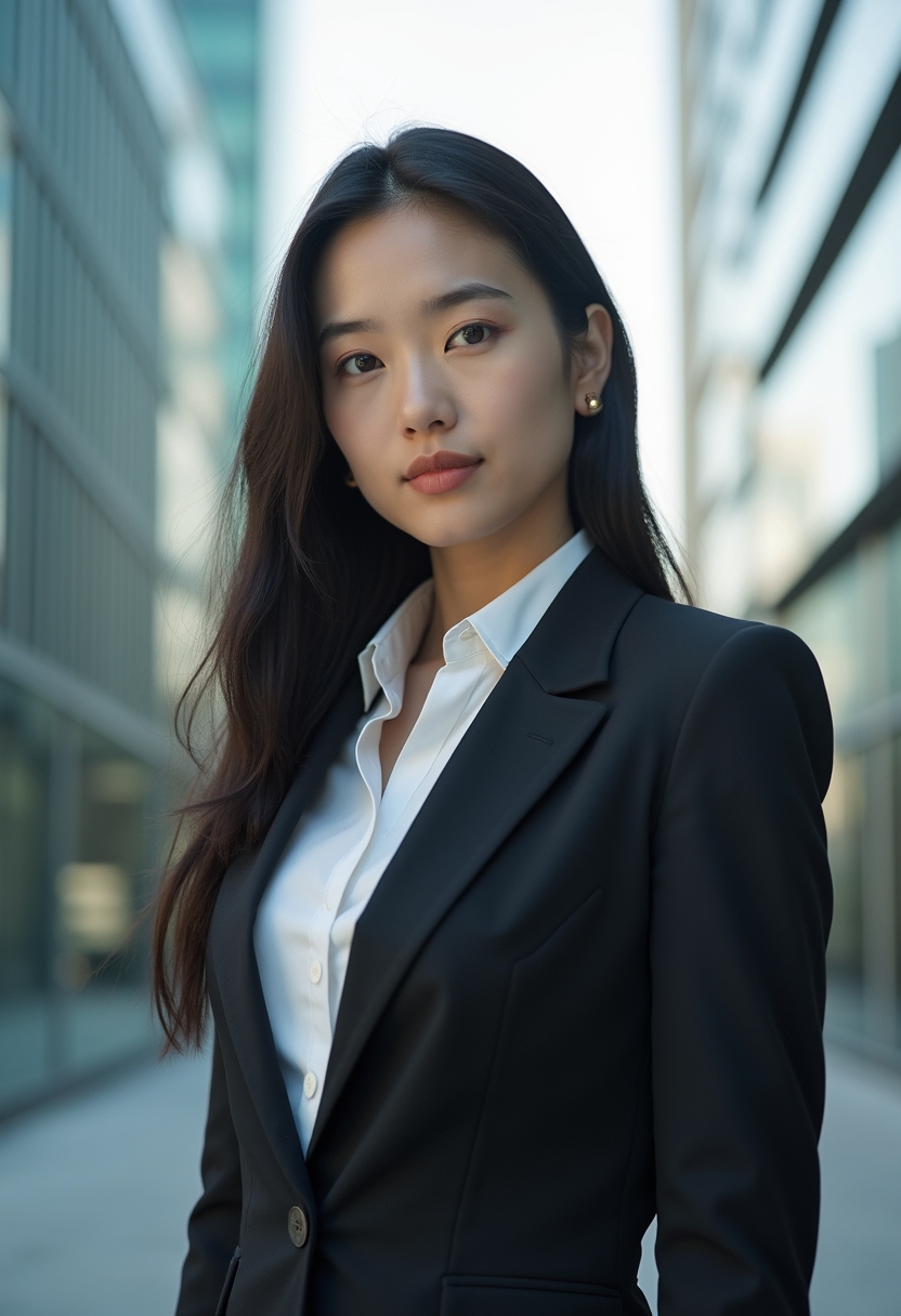 Өз бейнеңізде көруІскерлік костюмдегі әйел заманауи зәулім ғимараттардың фонында тұр, тікелей камераға қарайды, айналасында қалалық шу