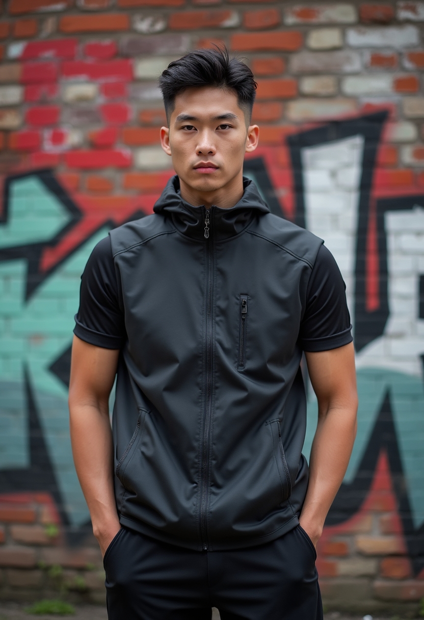 Спорттық киімдегі ер адам кірпіш қабырғадағы граффити фонында тұр, тікелей камераға қарайды