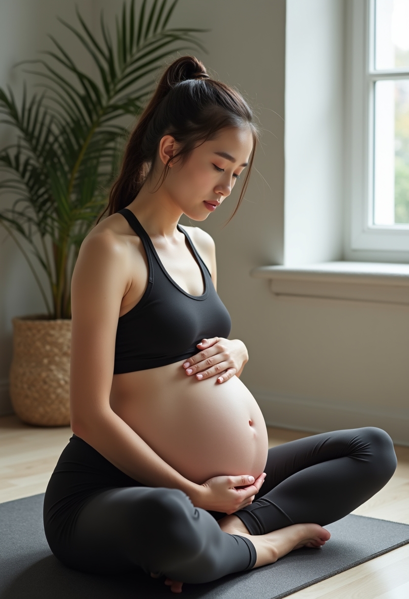 Спорттық киімдегі жүкті әйел йога төсеніші үстінде отырып, ішін қолымен құшақтап тұр, айналасы минималистік интерьер