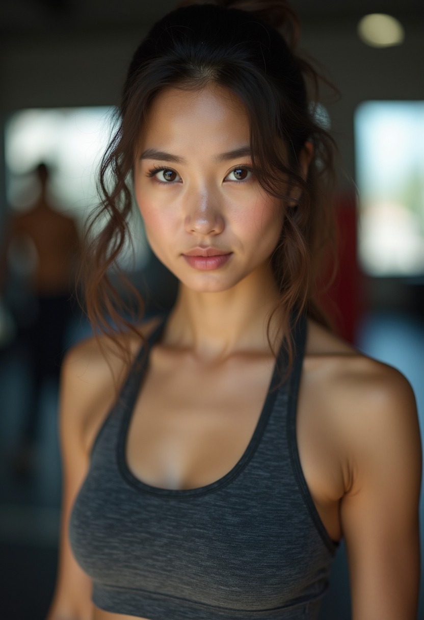 Өз бейнеңізде көруСпорттық топ пен шорты киген әйел залда орындықта отырып, тура камераға қарап тұр, қасында қолғаптар жатыр