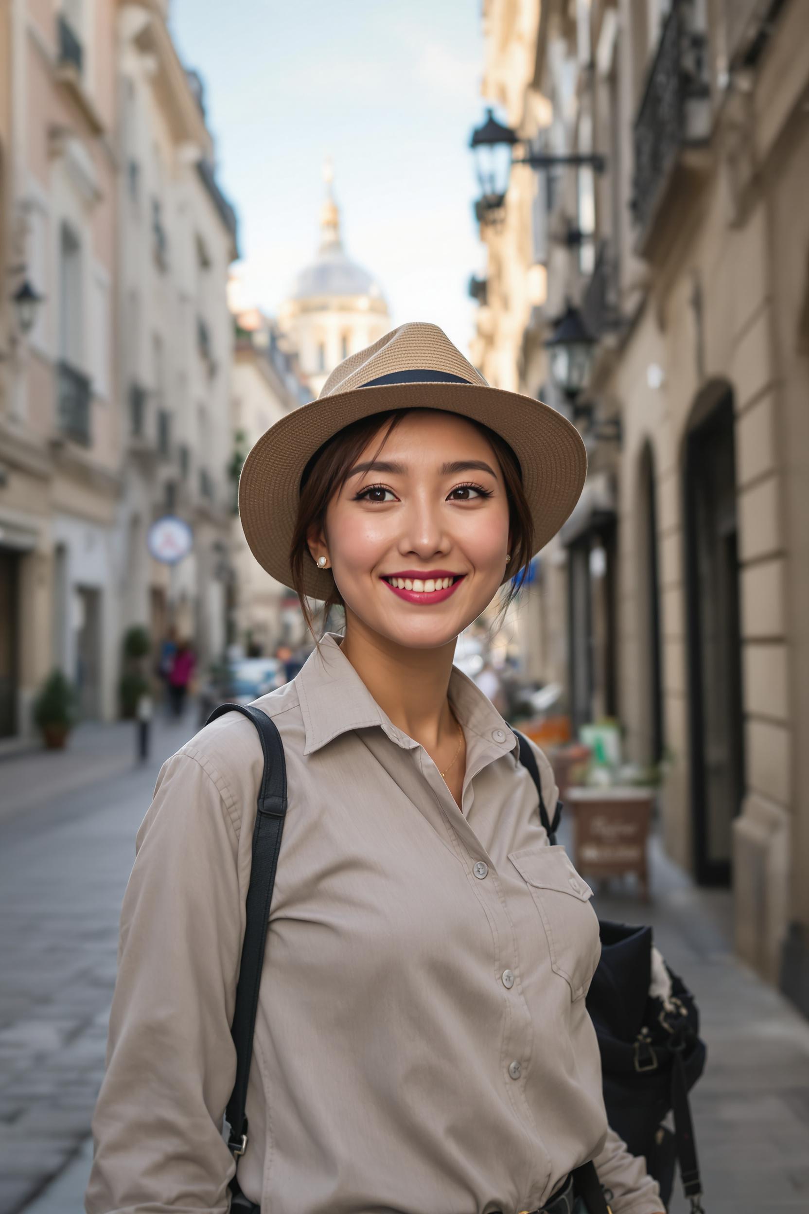 Таң шапағының жұмсақ сәулелерінде Париждің тыныш қалашық көшесінде жүріп, артында көне архитектуралық ғимараттар көрінеді. Ортаңғы кадрда классикалық жейде мен шляпа киген әйел адам камераға қарап, жымиып тұр. Айналасы тыныш және бейбіт, атмосфера әсерлі және ескерткіштік.