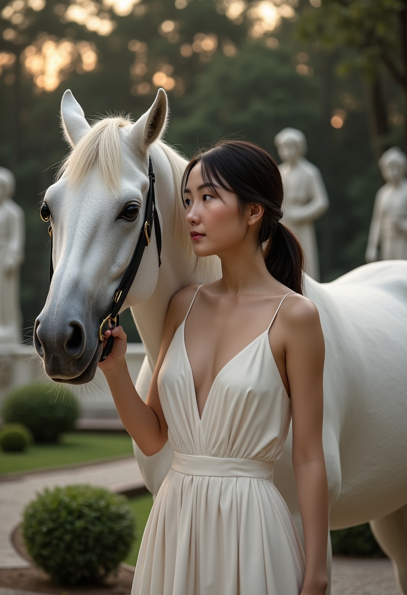 Тар, терең V пішінді көйлек киген әйел ақ аттың жалын сипап тұр. Фонда жұмсақ жарық түскен мәрмәр мүсіндері бар ескі бақша мен ирек жолдар көрінеді.