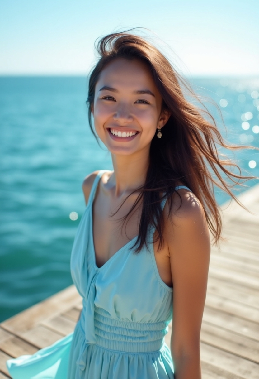 Тізеге дейінгі көгілдір жеңіл сарафан киген әйел пирсте тұр, шашы желмен тербеліп жатыр. Ол камераға қарап күлімсіреп тұр. Артында күнге шағылысып жатқан шексіз көгілдір теңіз. Жақын план, жазғы көңілді көңіл-күйге басымдық берілген.