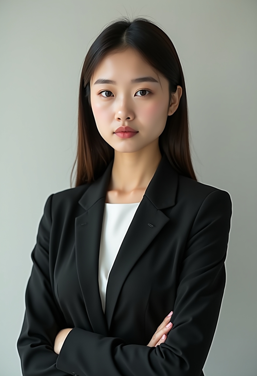 Өз бейнеңізде көруҚатаң іскерлік костюм киген әйел бейтарап сұр фонда, студиялық жұмсақ жарықта, тура камераға қарап тұр