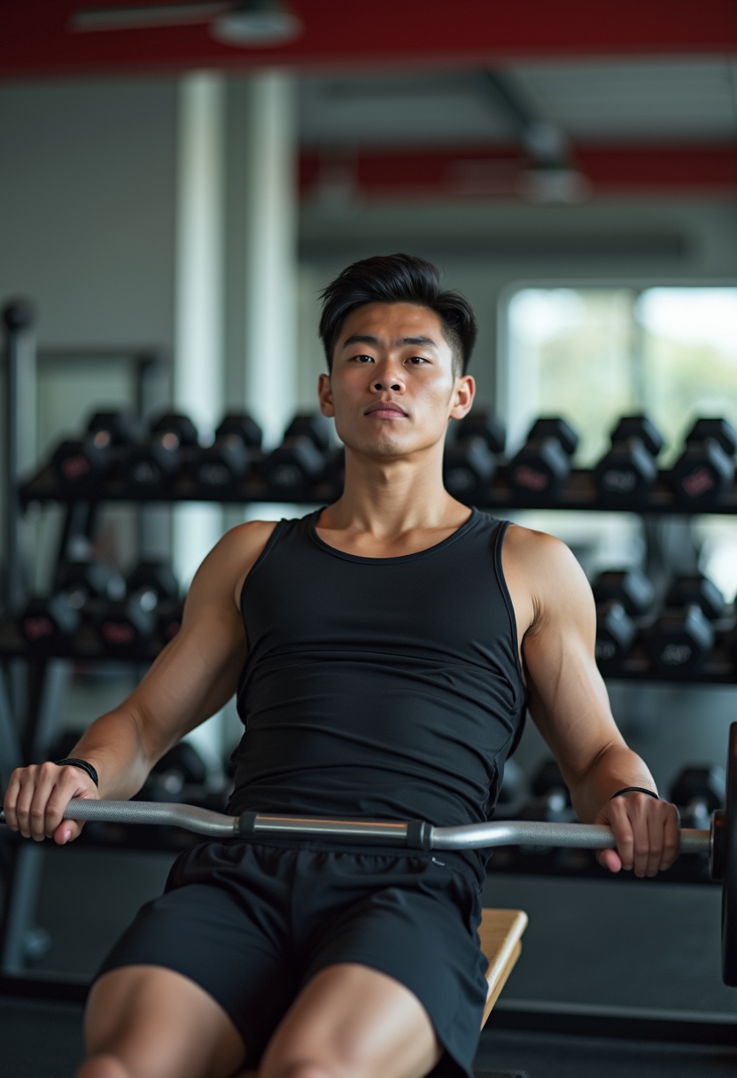 Тығыз спорт майкасы мен шорты киген ер адам заманауи жаттығу залында орындықта жатып штанга көтеру жаттығуын орындайды. Ол камераға байсалды жүзбен қарайды. Артында гантельдер сөрелері мен жаттығу құрылғылары көрінеді. Жарық жарқын, екпін оның физикалық күші мен кәсібилігіне қойылған.