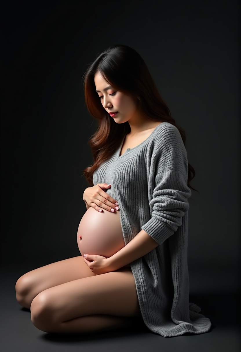 Үлкен іші бар, бір иығынан төмен түсіп тұрған сұр трикотаж жемпір киген жүкті әйел қара фон алдында жерде отыр. Оның тізелері бүгіліп, қолдары ішін нәзік құшақтап тұр. Контрастты жарық, бүйірден бағытталған, матаның текстурасы мен дененің жұмсақ сызықтарын ерекшелейді. Үлкен кадр, екпін іштің...
