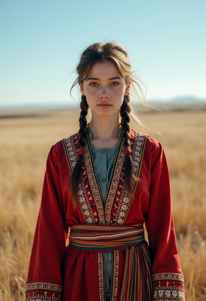 Киіз үйдің алдында дәстүрлі киім киген жас әйел отыр, оның үстінде оюлы шапан, бастары әшекейлі орамалмен жабылған. Шағыл құмдар мен көк аспан көрініп тұр, ал әйелдің жанары камераға назар аударған.