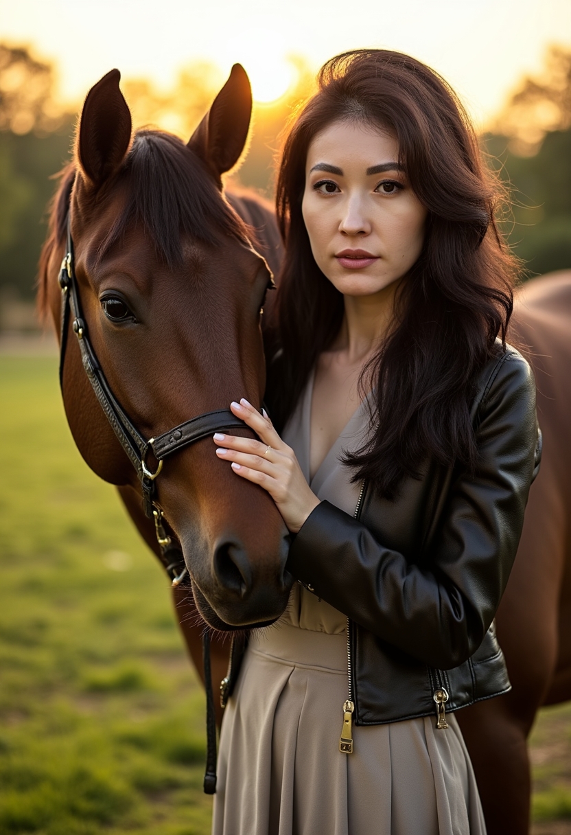 Ұзын көйлек пен былғары жамылғы киген әйел аттың мойнын сипап тұр, артында жасыл жайылым мен күн көрінеді.