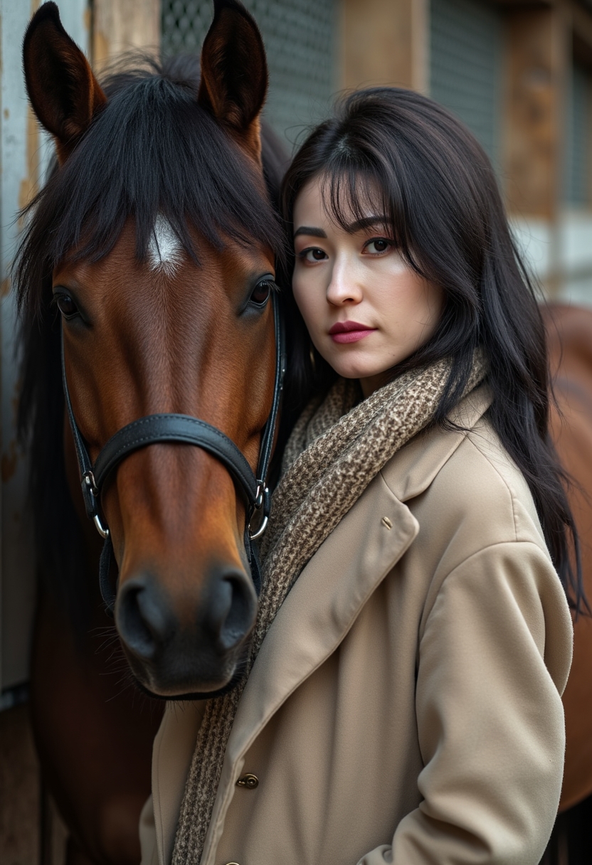 Ұзын пальто мен шарф киген әйел аттың жанында, ескі қораның фонында тұр, тура камераға қарайды.