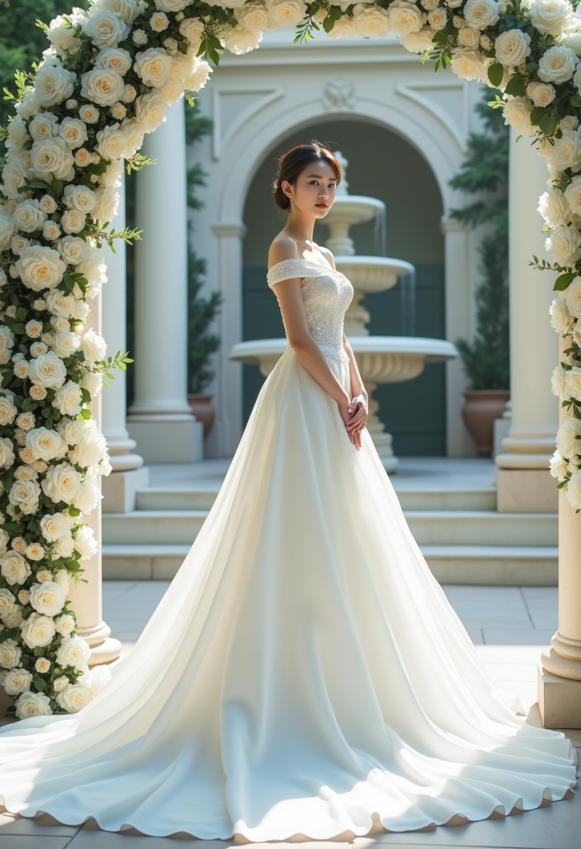 Ұзын шлейфі бар салтанатты ақ көйлек киген қалыңдық ақ раушан аркасының астында тұр. Қолдарын алдына қойып, көзі алыста. Артында мәрмәр бағаналар мен сәндік фонтан. Жұмсақ жарық, романтикалық сәтке екпін береді.