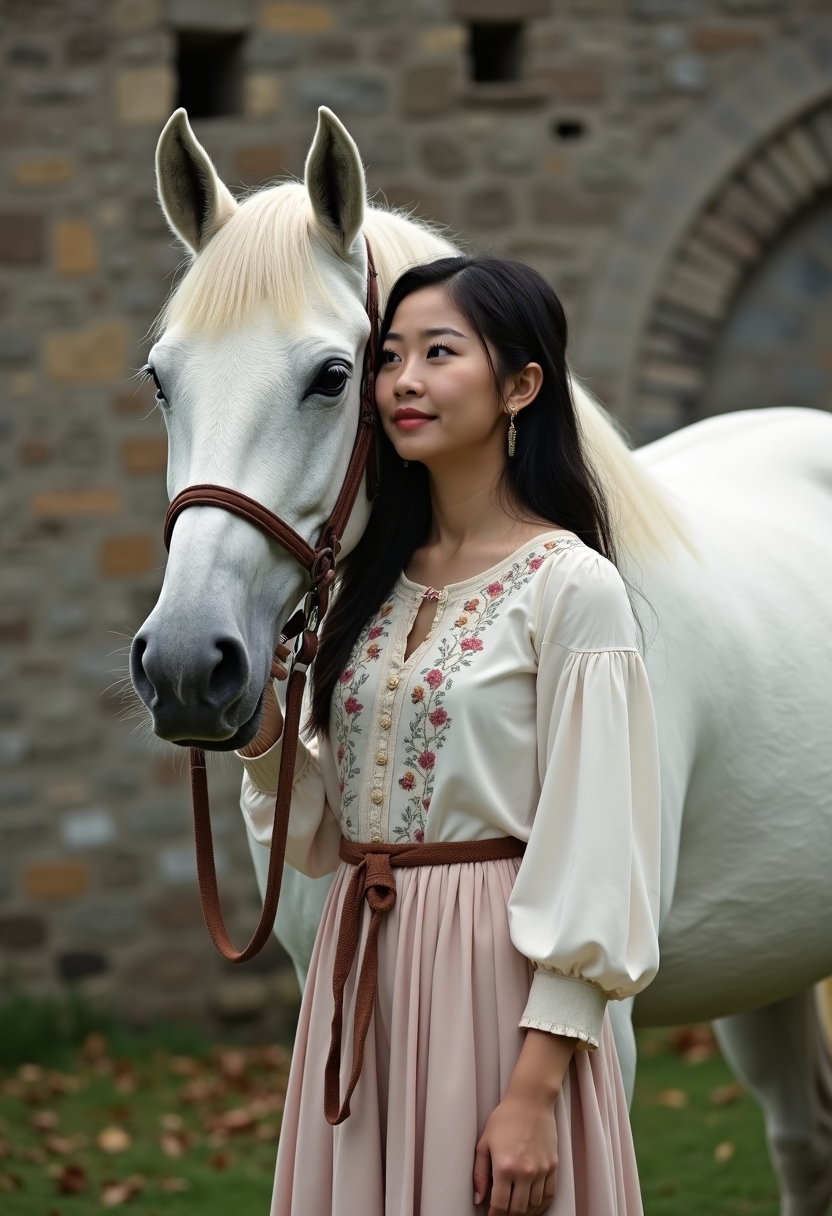 Ұзын юбка мен кестелі жейде киген әйел ақ аттың жанында тұр, артқы фонда ескі қамалдың тас қабырғасы көрінеді.