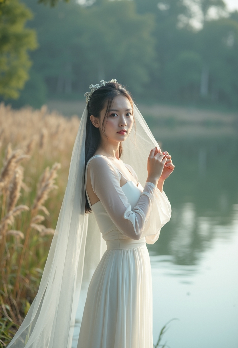 Ұзын жеңді жеңіл көйлек киген қалыңдық көл жағасында тұр, бейнесі суда көрініс тапқан. Ол жанға қарап тұр, қолдары фатаға тиіп тұр. Артында қамыстар мен желмен тербелген ағаштар. Жұмсақ жарық, табиғилық пен үйлесімдікті көрсетеді.