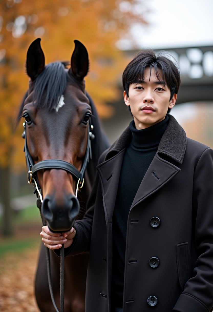 Водолазка мен пальто киген ер адам аттың жүгенінен ұстап тұр, артында ескі көпір мен күзгі ағаштар.