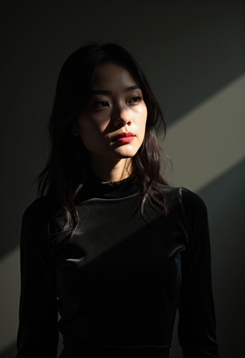 Қара пиджак киген әйел қара қабырға фонында отыр, оның жүзіне екі жіңішке жарық сызығы түсіп тұр — бірі ерініне, бірі бет сүйегіне тиеді. Қалған кеңістік қараңғылықта. Жарық нүктелік, бөлшектер мен текстураны айқындайды.