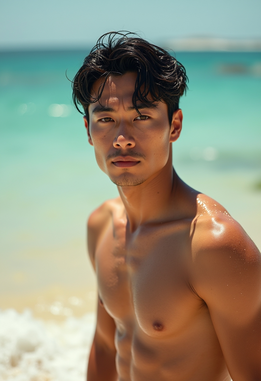 Жалаңаш денелі, терісі күнге күйген ер адам теңізден шығып келеді, иығынан су тамшылап тұр. Оның көзі камераға қараған, артында алтын құм мен жаға толқыны. Жақын жоспар, теңіздегі жаздың сергектігі мен қуатын айқындайды.