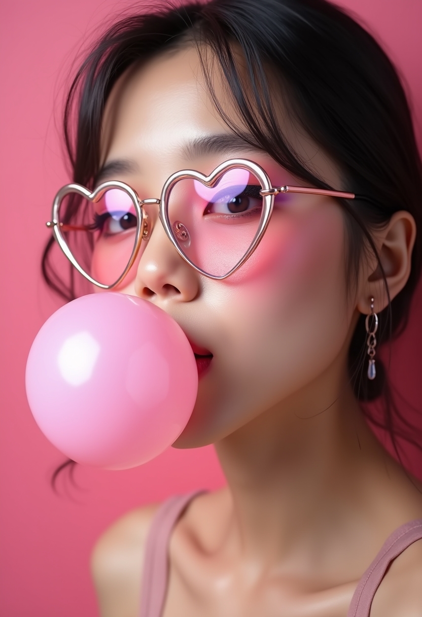 Жанынан түсірілген кадр: ол үлкен қызғылт сағызды үрлеп тұр, мұрнында жүрек пішінді қызғылт линзалы көзілдірік, ол жарықты шағылыстырады. 8K ажыратымдылықтағы ультрареалистік ірі пландағы портрет: көз қабақтарындағы айқын қызғылт бояу, әсерлі қара лайнер, ұзын әрі қалың кірпіктер және жұмсақ қызғылт еріндер. Артқы фонда — бейнесімен үйлескен қанық қызғылт түс. Тері інжу тәрізді жылтырап, нәзік гламур әсерін тудырады. Үйлесімді, көз тартарлық, нағыз шедевр.