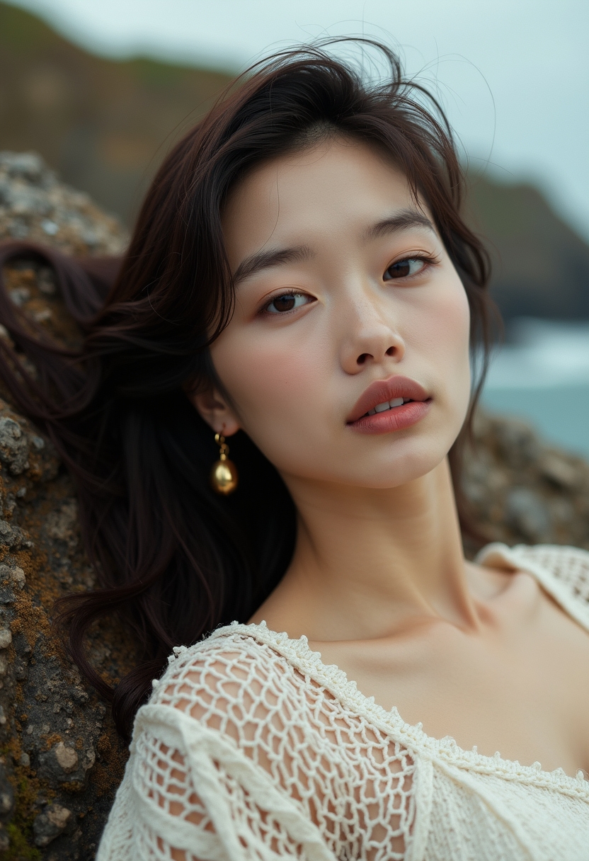 Профильде түсірілген сурет. Ол алысты қарап тұр, шашы желбіреп тұр. Артқы фонда — жартастар, теңіз. Ұзын ақ тоқылған көйлек, суланған шаш, алтын минималистік сырғалар. Түстер — алтын, сарғыш, ақ.