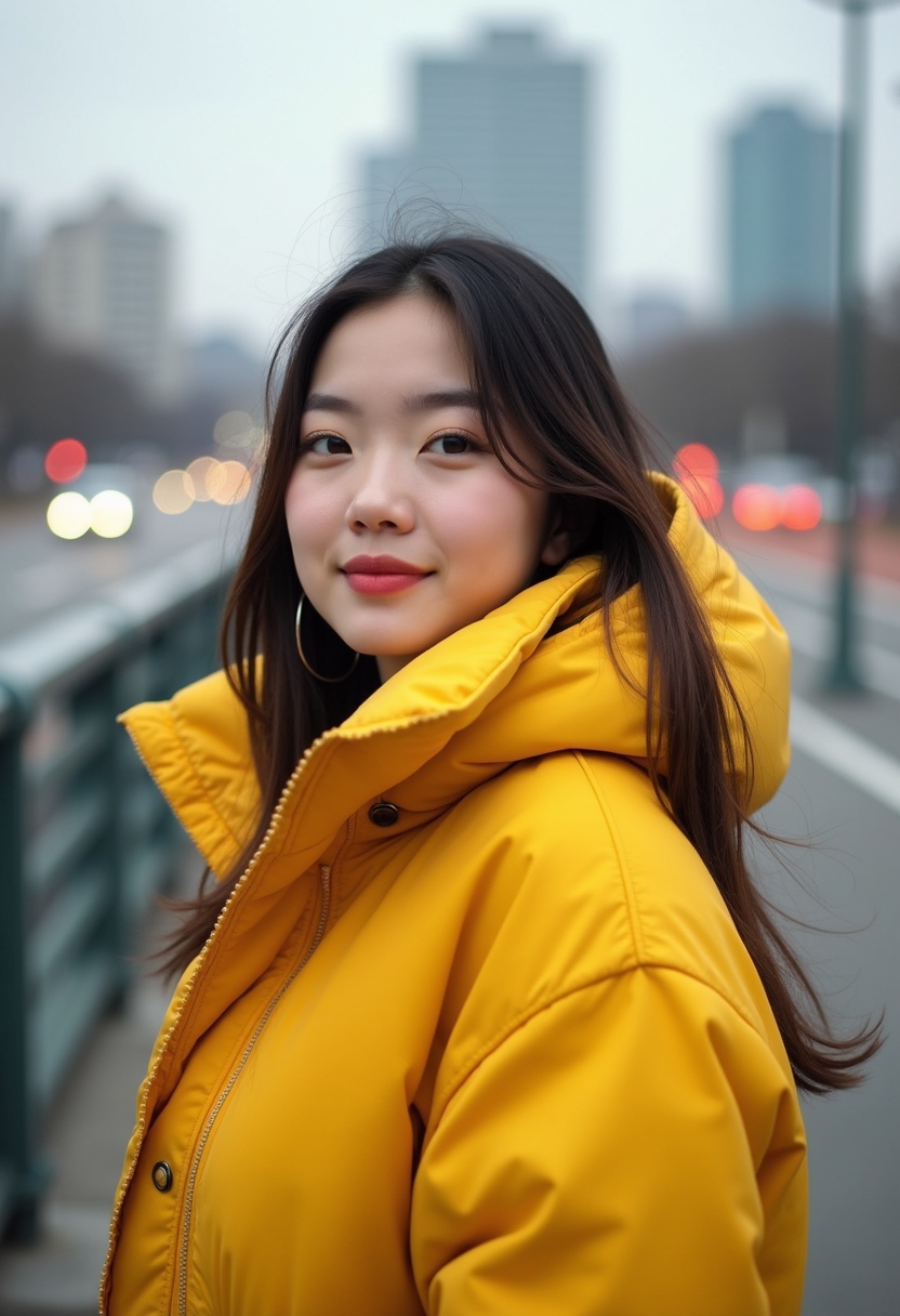 Жарқын күртке киген әйел көпірде тұр, астында қалалық қозғалыс көрініп тұр, тікелей камераға қарайды