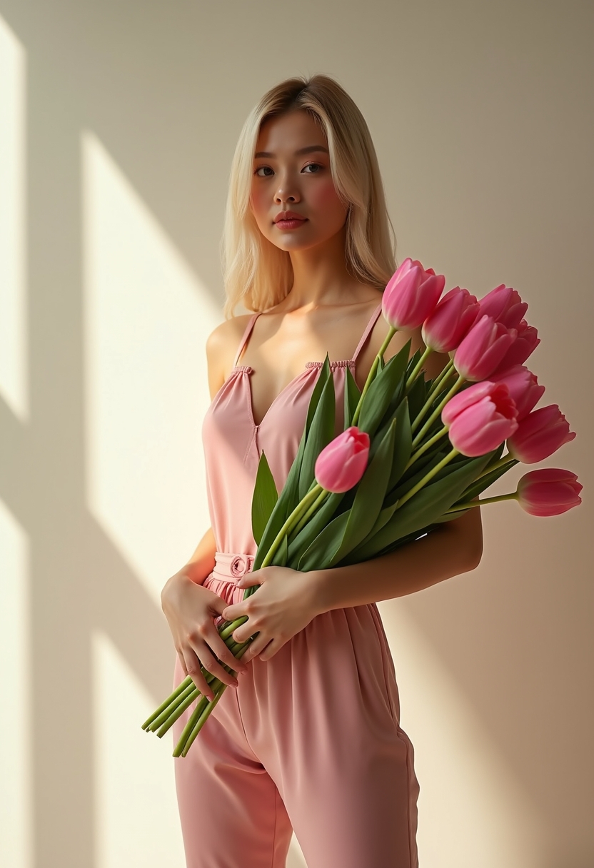 Жарқын күн сәулесі түскен фотостудияда ақшыл түсті түзу шашты қыз поза жасап тұр. Ол ашық қызғылт түсті кең брючный костюм киген, үлкен қызғылт қызғалдақтар шоғын құшақтап тұр.