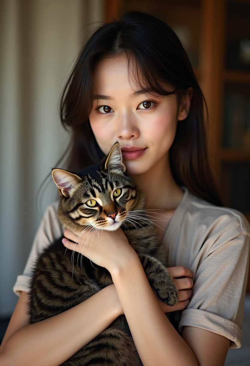 Жас әйел мысықты ұстап тұр, көздері камераға қараған, табиғи жарықпен жылы үйде.