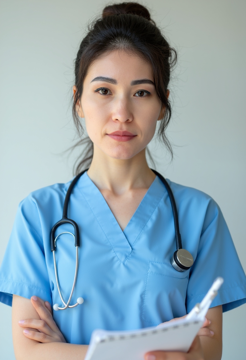 Өз бейнеңізде көруМедициналық форма киген әйел-дәрігер, минималды макияжбен және сенімді көзқараспен, ашық сұр фонда ірі жоспар, тура камераға қарап тұр. Басында цилиндр пішінді ақ қалпақ