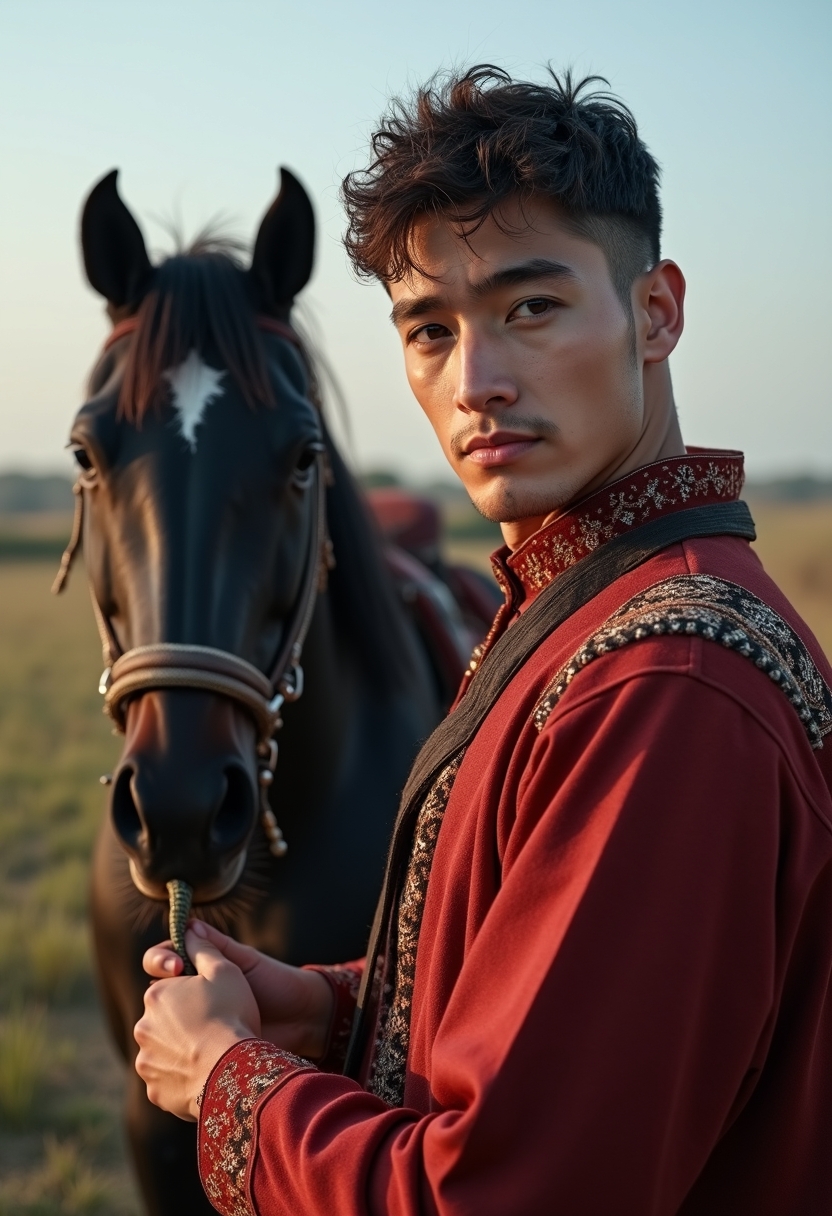 Өз бейнеңізде көруҚара шапан мен алтынмен зерленген белбеу таққан ер адам қара аттың жанында тұр. Ол тура камераға қарап, қолын аттың мойнына қойып тұр. Артында күн сәулесімен жарқыраған жайлаудың жасыл шөбі көрінеді. Аттың жүгеніндегі әшекейлер қазақ мәдениетін бейнелейді.