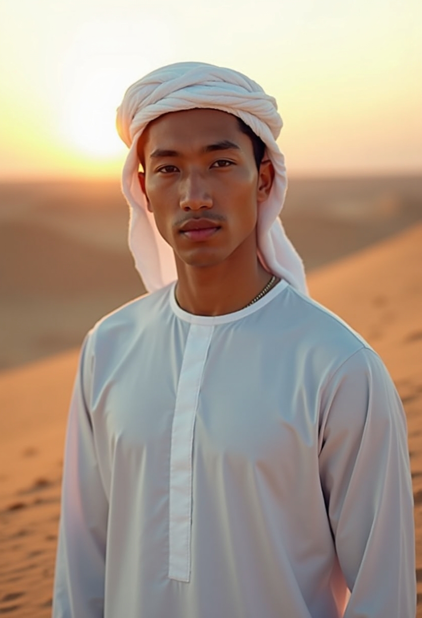 Өз бейнеңізде көруЖас жігіт ақ түсті дәстүрлі араб киімінде (кандура) және басына куфия орамалын таққан күйі құмды төбешікте тұр, артында шексіз шөл дала мен күннің батуы байқалады, жүзі камераға тіке қараған, келбеті сабырлы әрі салмақты.