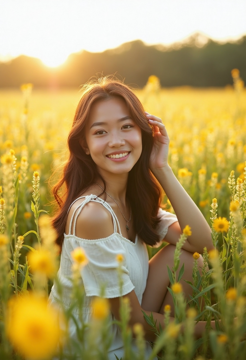Жаз мезгілінде, ашық аспан астында, сары-жасыл далада орналасқан адам орта жоспарда. Ол камераға сүйкімді күлімсірап қарап тұр, шаштарына күннің жылы сәулелері түсіп, табиғаттың сұлулығын толығымен сезінуде. Айналасында нәзік желмен тербелген гүлдер мен жасыл өсімдіктер.
