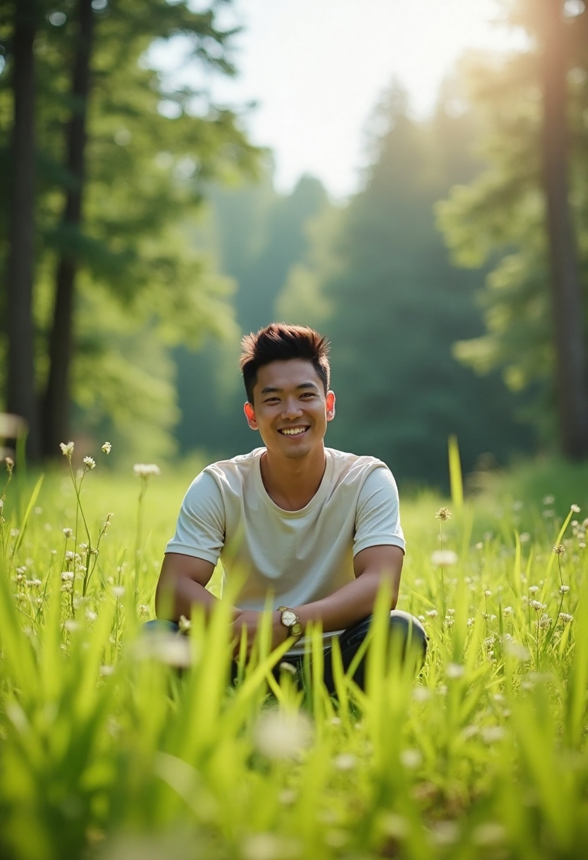Жаз айының жайма-шуақ күні, әсем табиғат аясындағы жасыл шөпке отырушы адам орта жоспарда. Ол камераға жүзімен қарап, күлімдеп тұр. Айналасына кең жапырақты ағаштар мен гүлдер көмкерілген, күннің жарығы бетінде нәзік ойнап тұр.