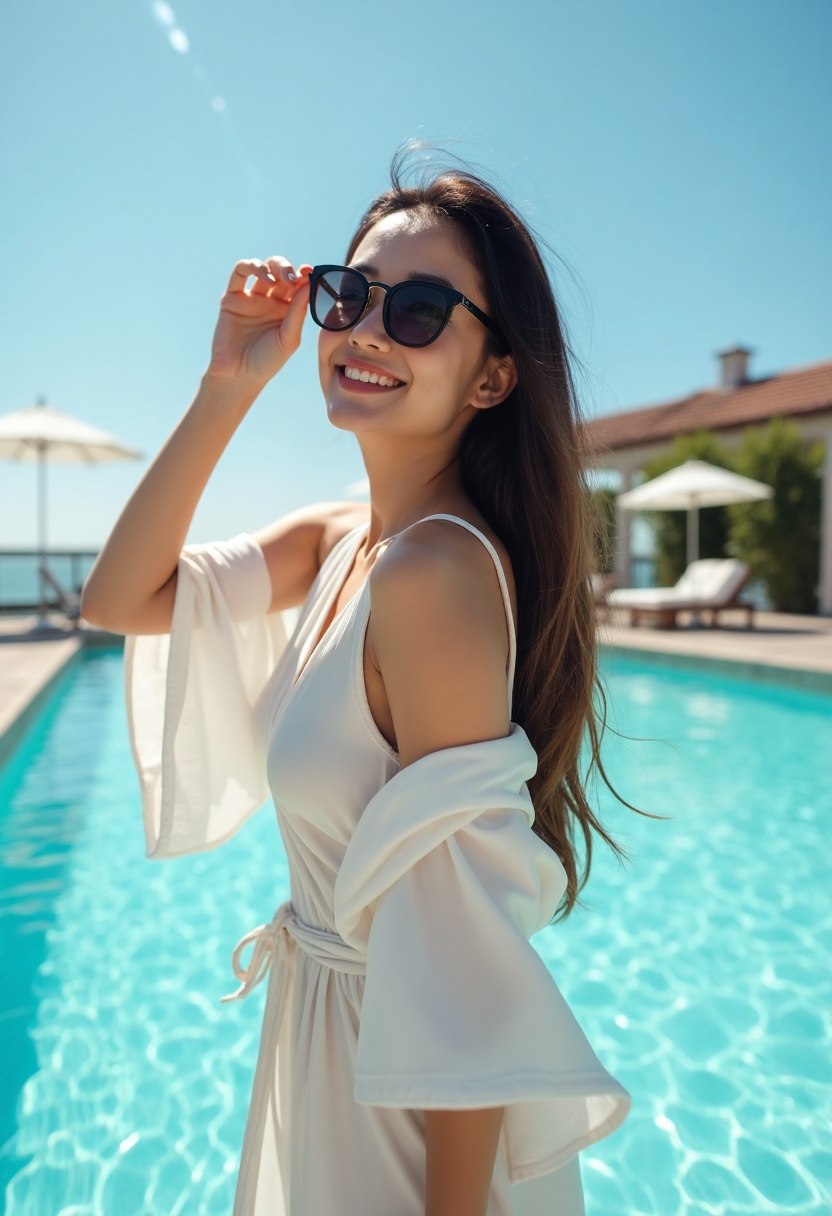 Өз бейнеңізде көруӘдемі көріністе бассейннің жанында тұрған жас келіншек. Ол қысқа жеңді жазғы көйлегін киіп, қолында су ұстаған стақан бар. Бассейннен керемет көрініс сезіліп, келіншек камераға сүйкімді күлкімен қарап тұр. Оның шашы самал желде тербеліп, аясында күннің нұры ойнақшып тұр.