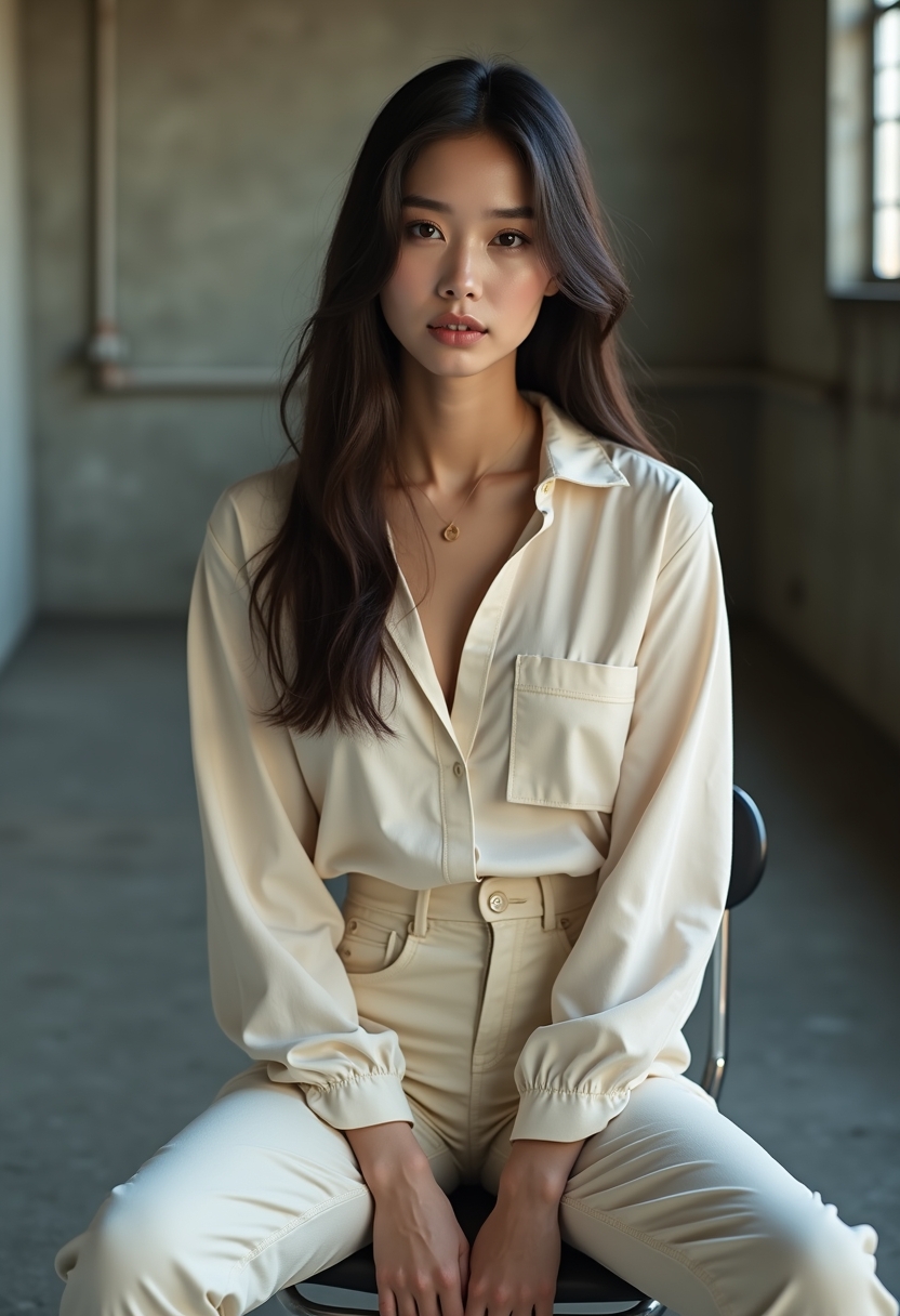 Жеңіл блузка мен шалбар киген әйел бетон қабырғалы, индустриялық шамдары бар кеңістікте металл орындықта отыр.