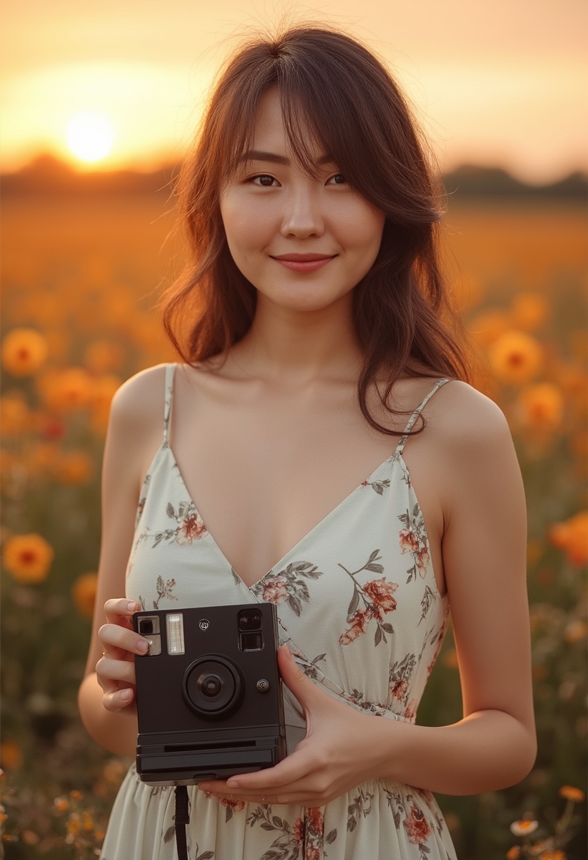 Жеңіл гүлді көйлек киген қыз күнбатыста гүлзарда тұр. Ол қолындағы полароид камерасын ұстаған күйі камераға күлімсіреп қарап тұр. Артында алтын түсті аспан күмбезі мен шөптер көрінеді, барлығы жылы фон құрайды.