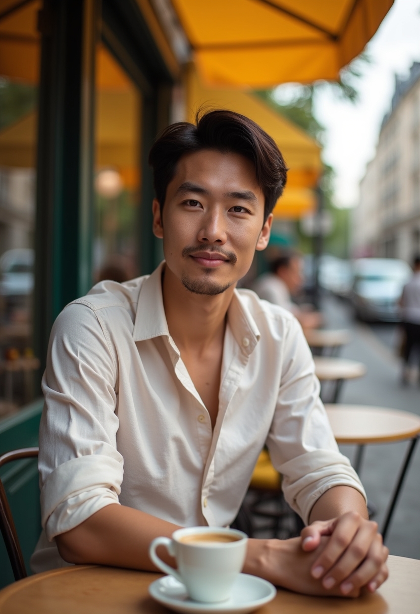 Жеңіл мақта көйлек пен ашық түсті шалбар киген ер адам көше кафесінің үстелінде отырып, қолында эспрессо бар. Ол күн сәулесінен сәл көзін сығырайтып тұр, ауада кофе иісі сезіледі. Артында жазғы қаланың бұлдыр көріністері. Жақын жоспар, Париж таңын елестетеді.