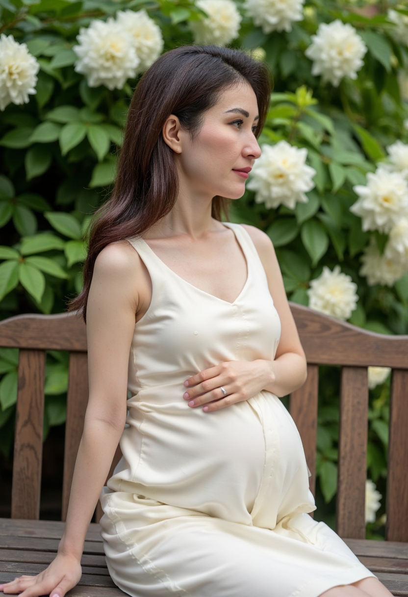 Жеңіл сарафан киген жүкті әйел бақтағы ағаш орындықта отырып, айналасында гүлдеген бұталар, ішіне күлімсіреп қарап отыр